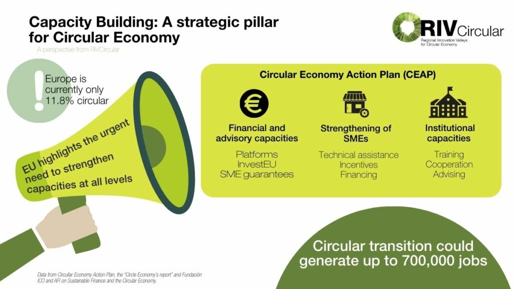 Various European Union documents highlight the urgent need to strengthen capacities at all levels: from small and medium-sized enterprises (SMEs) to public institutions. Among them, the most representative is the Circular Economy Action Plan (CEAP), which provides an ambitious roadmap to make the circular economy the new European economic standard.
